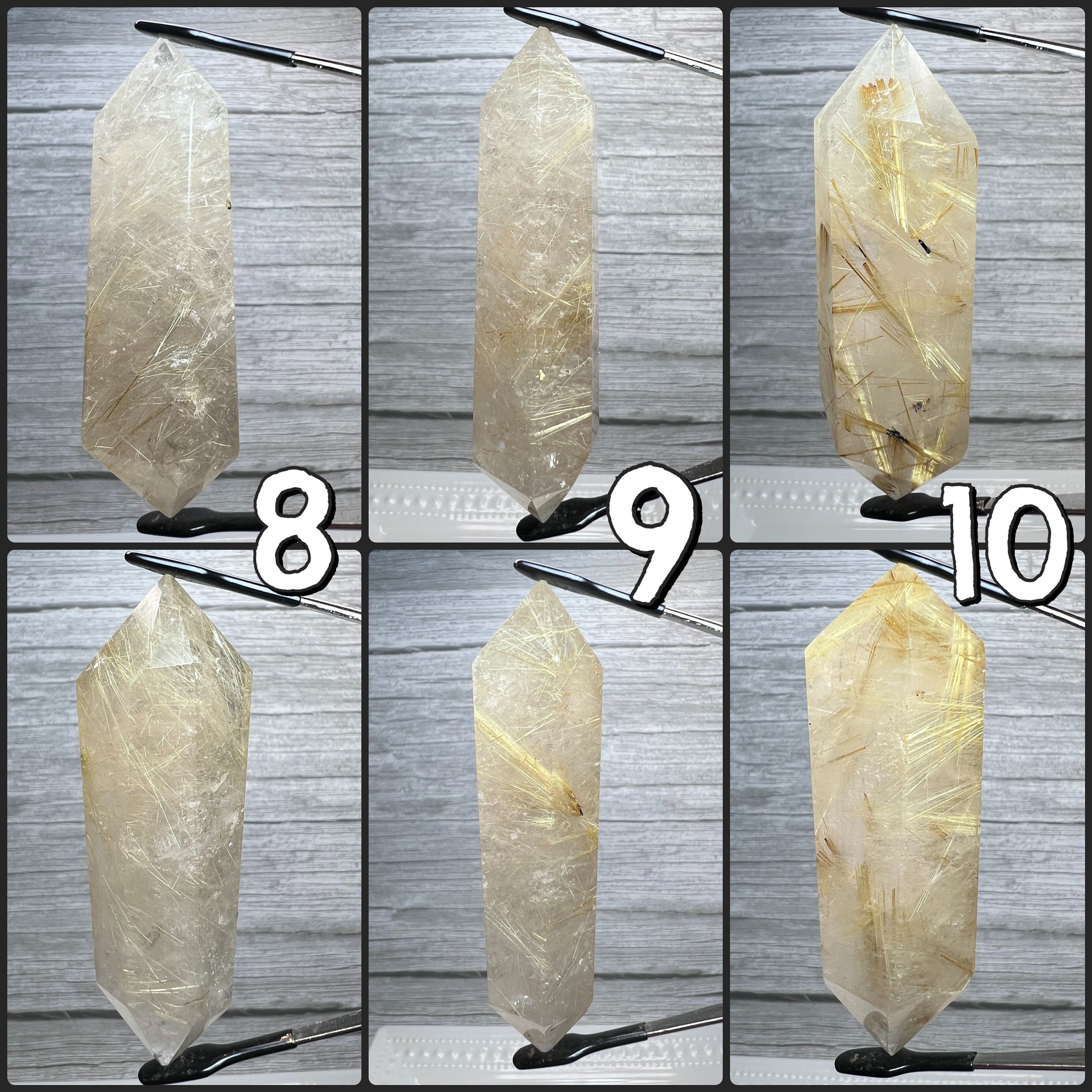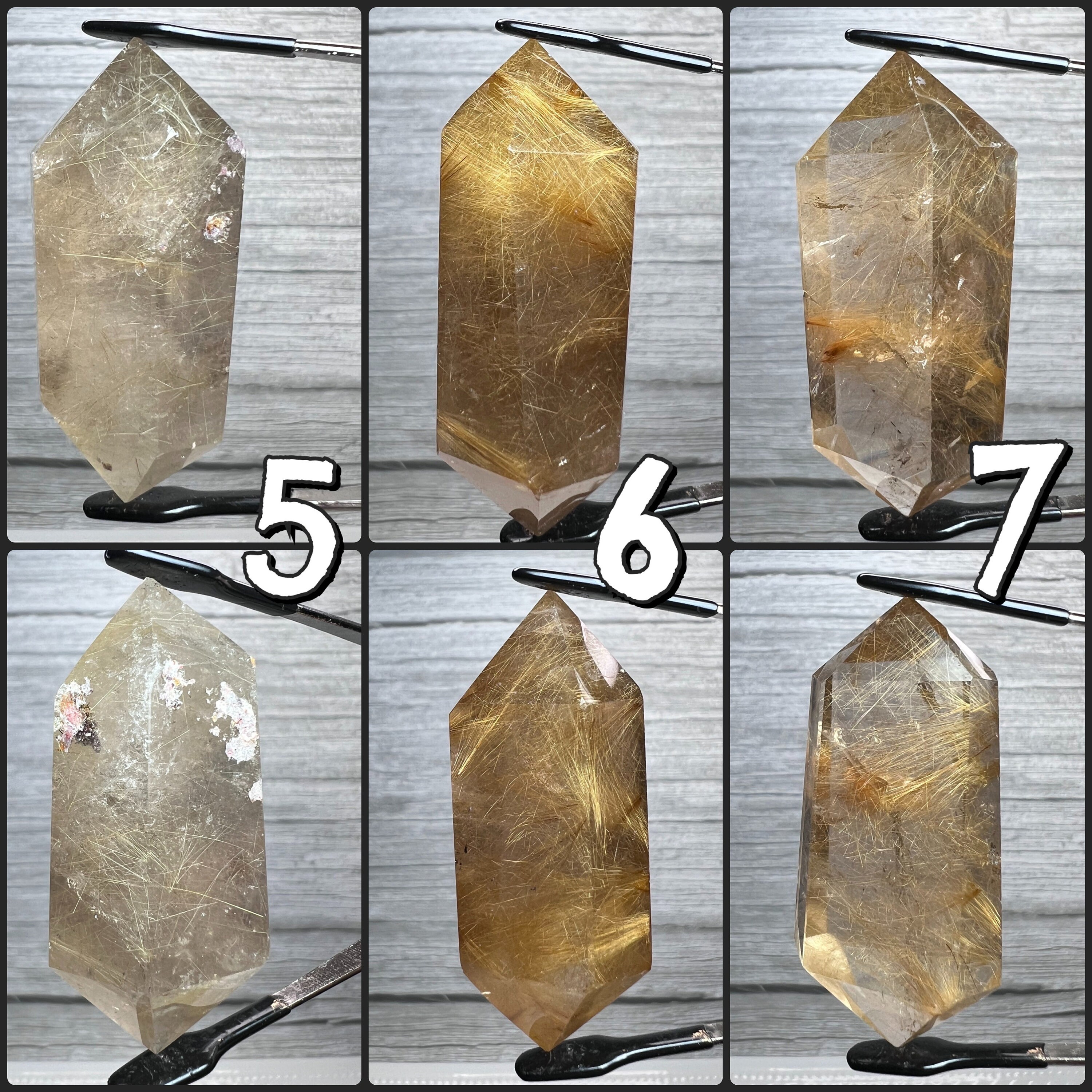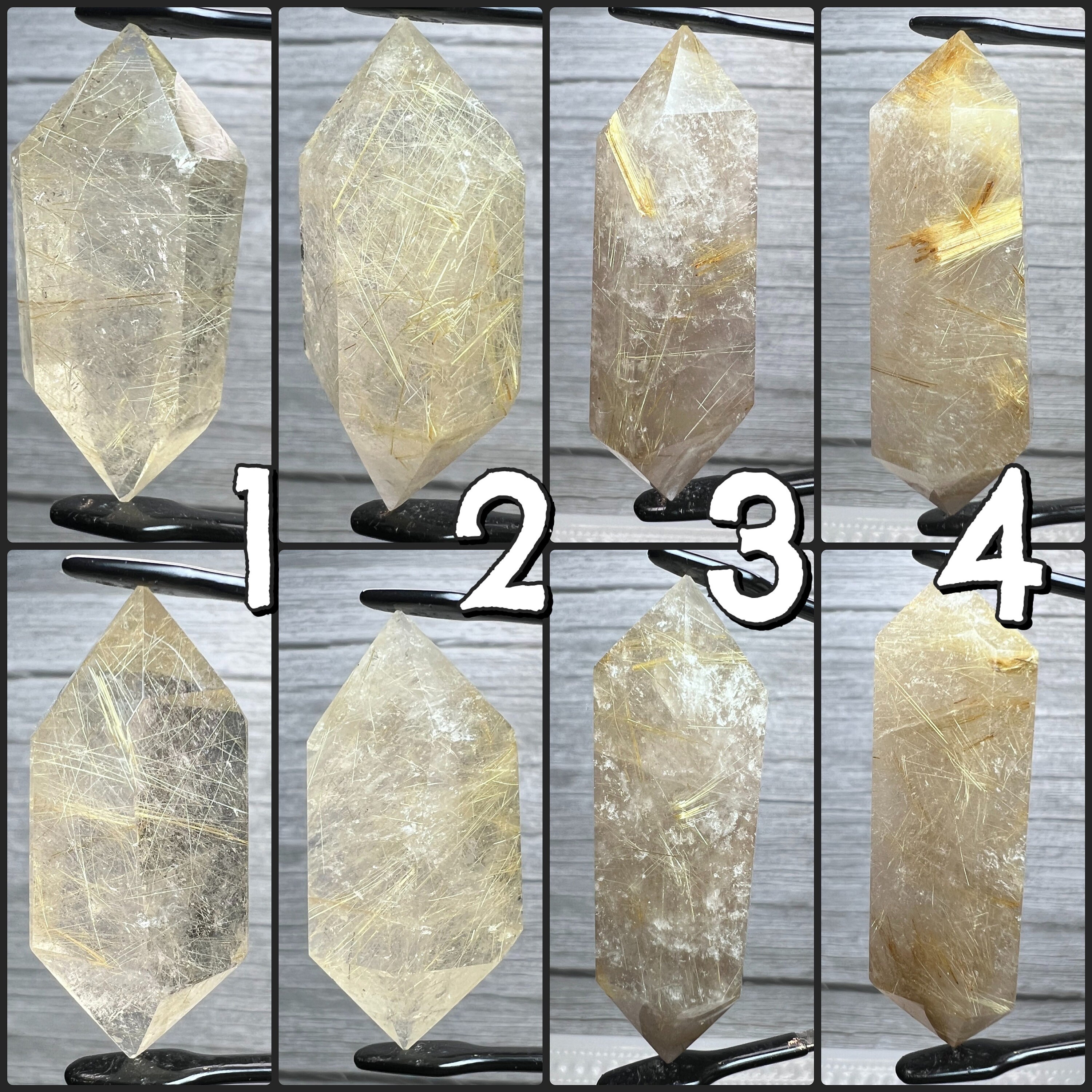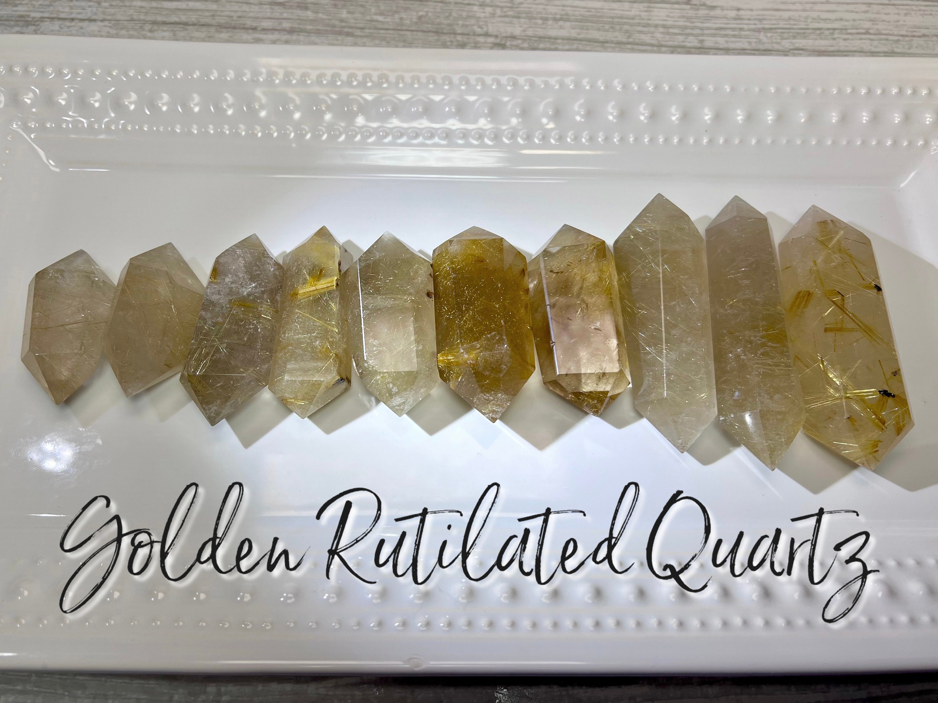 Rutilated Quartz – clear quartz riddled with needle-like pieces of golden rutile, a material made of titanium dioxide that are also known as "The Hairs of Venus". Rutilated Quartz can clear energy blockages from all of the chakras, and attune one to their Divine Purpose. Rutilated Quartz puts off an exceptionally high level of energy, and is said to bring physical and mental balance and stability. Rutilated Quartz also enhances self-reliance and helps with decision-making. Use Rutilated Quartz as a link between the Root and Crown Chakras, or to get to the “root” of a problem.