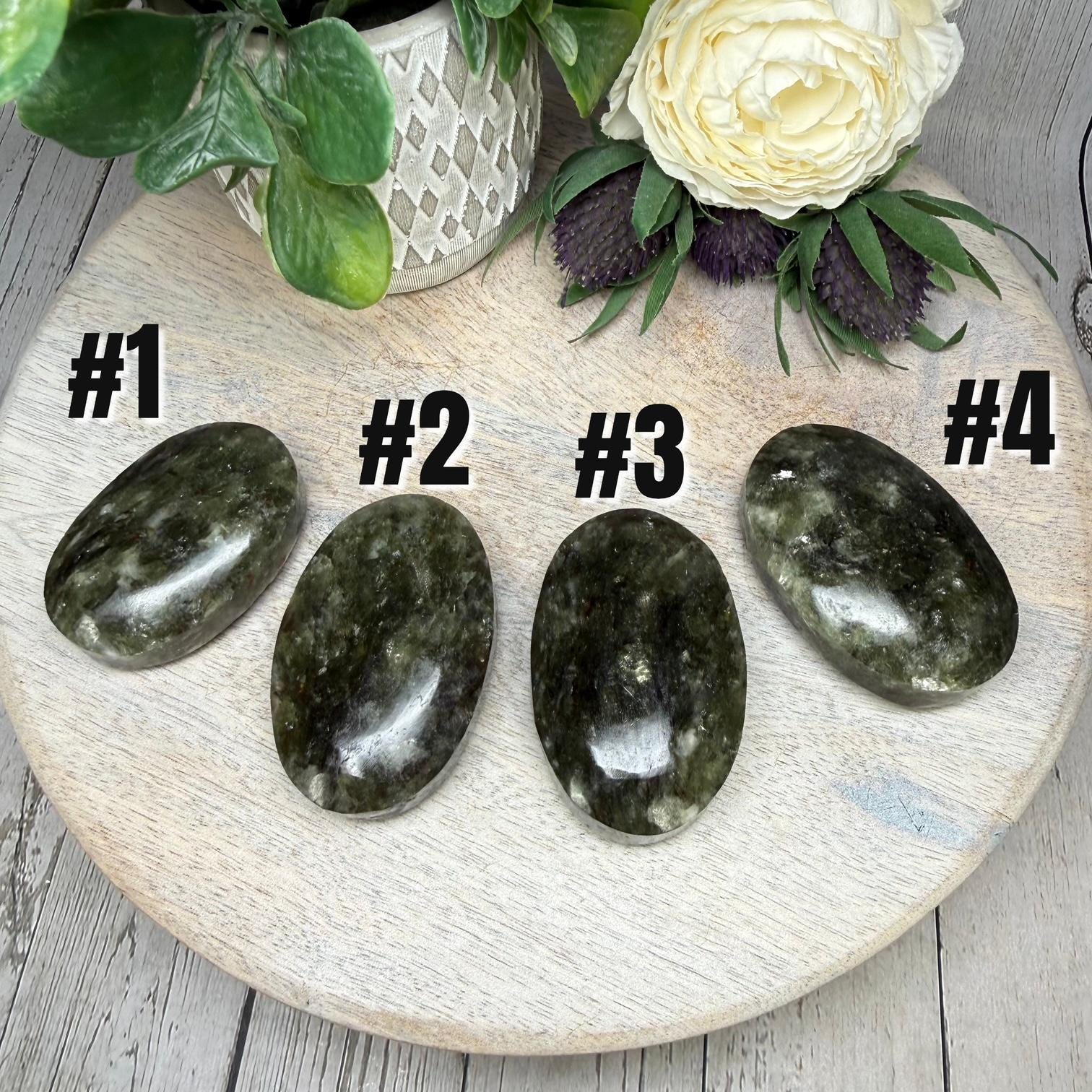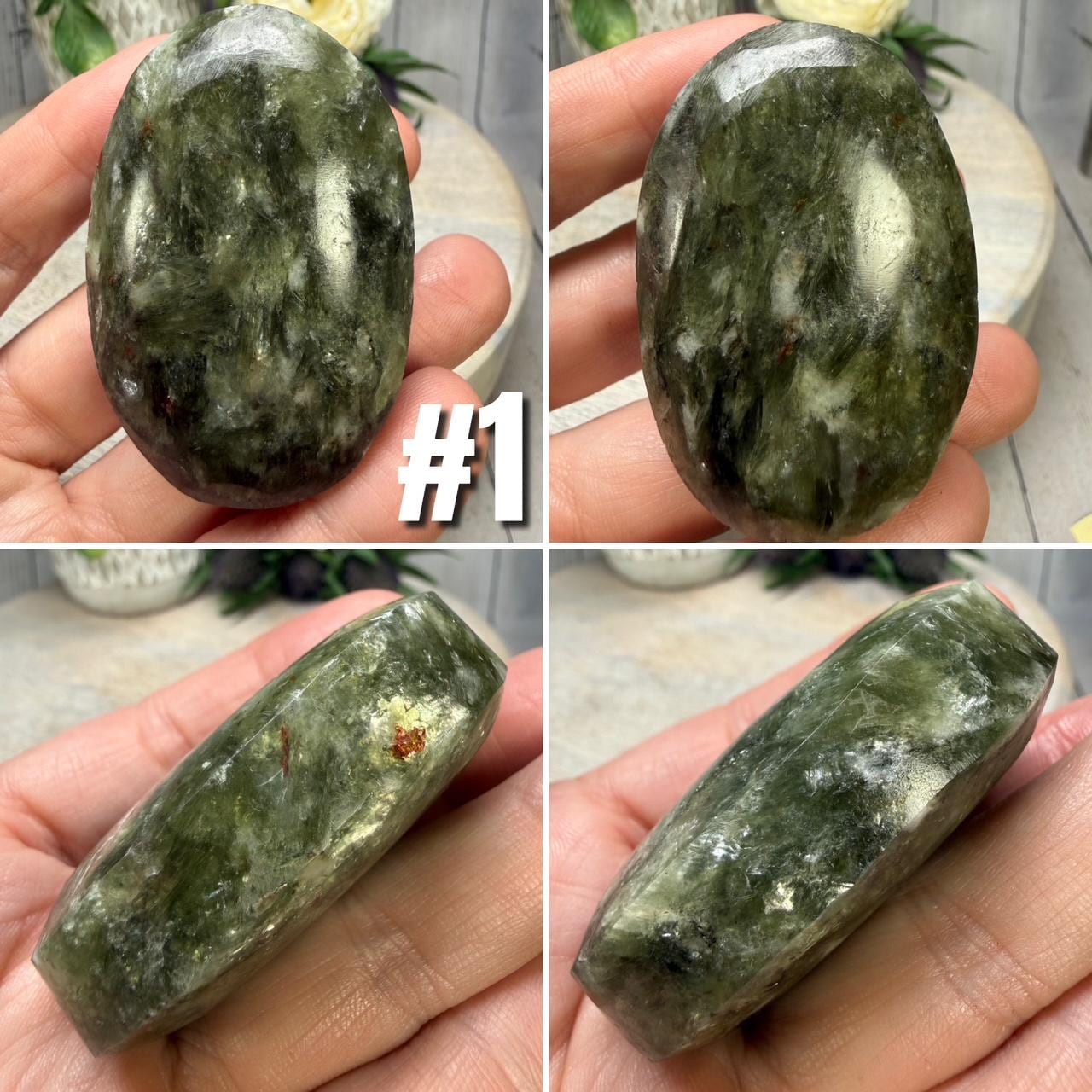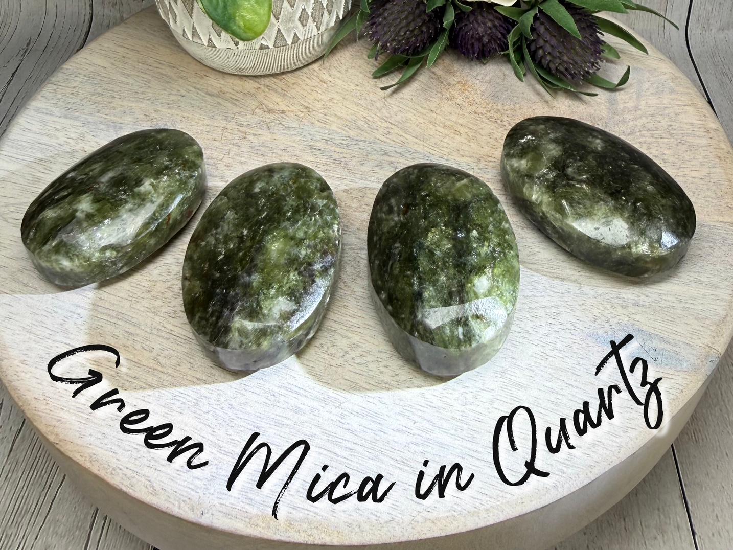 💚Green Mica in Quartz Palm Stone aka "Green Emerald Quartz"