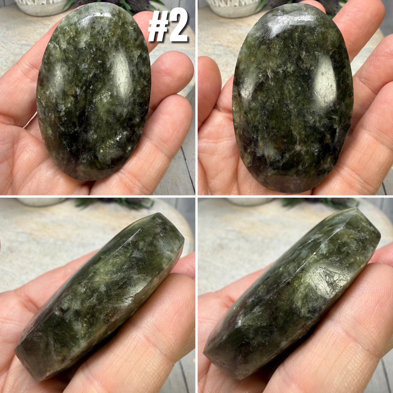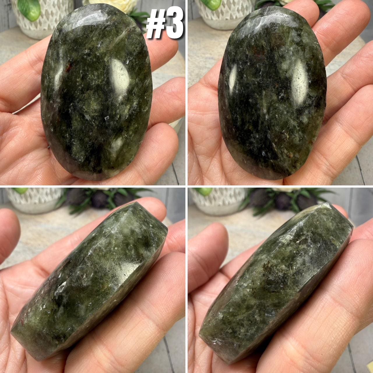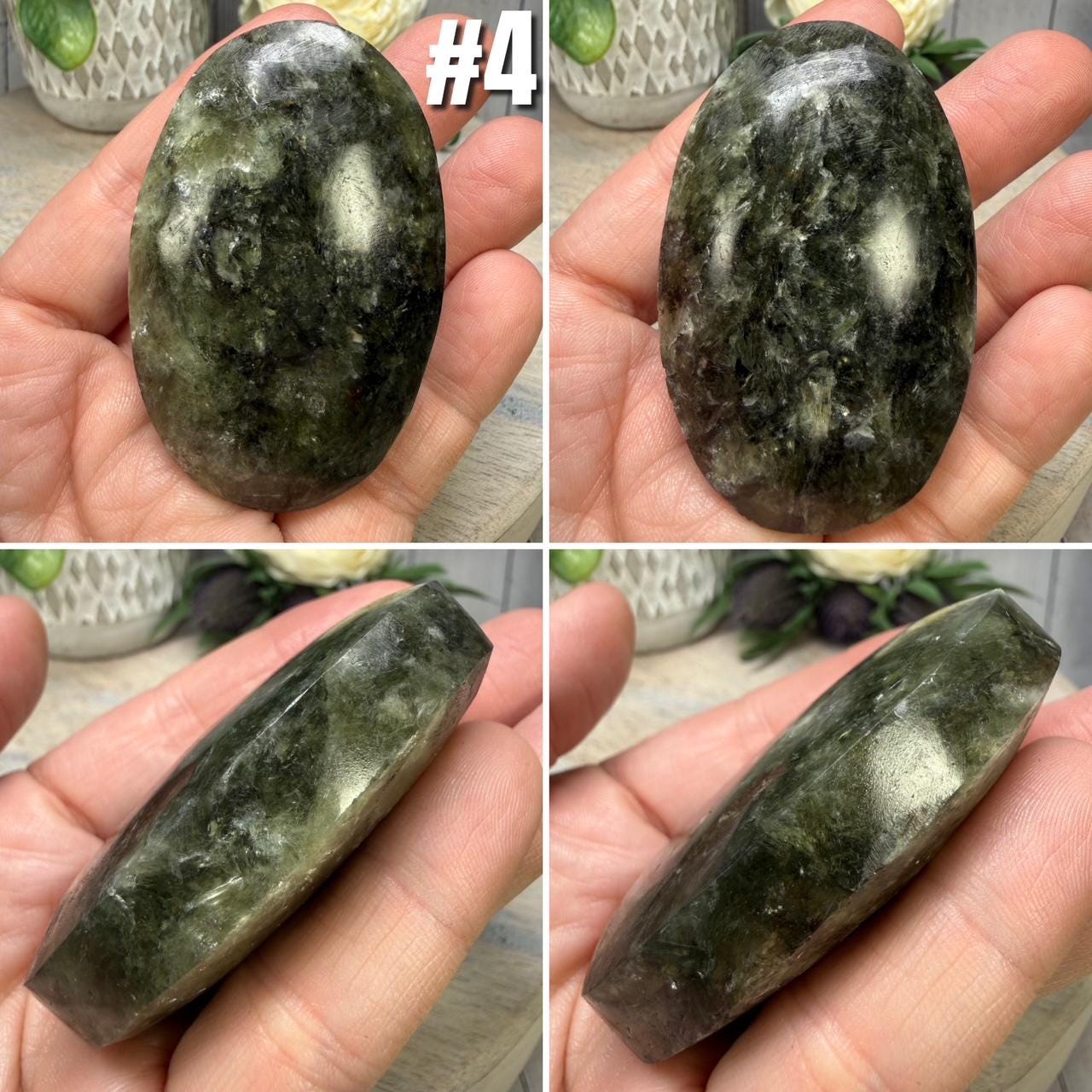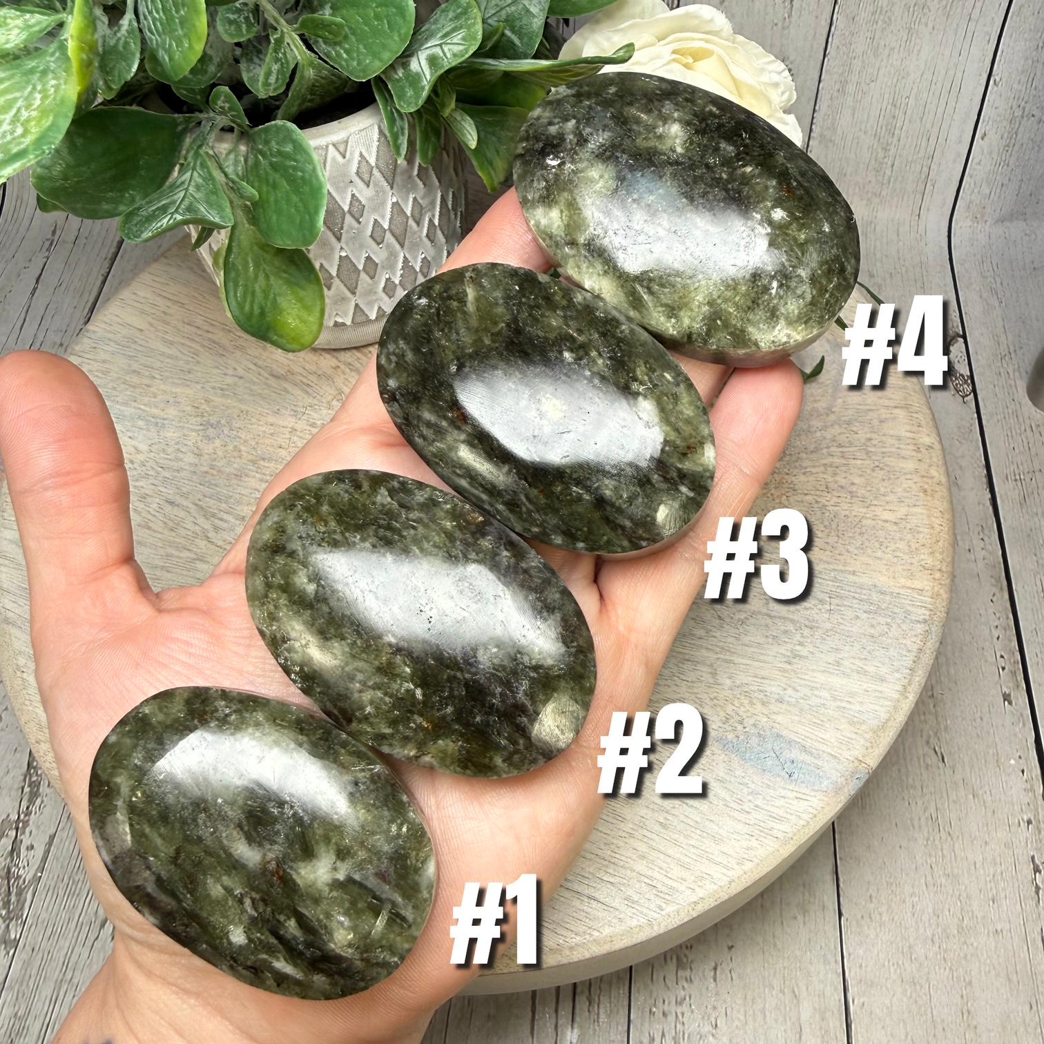 💚Green Mica in Quartz Palm Stone aka "Green Emerald Quartz"