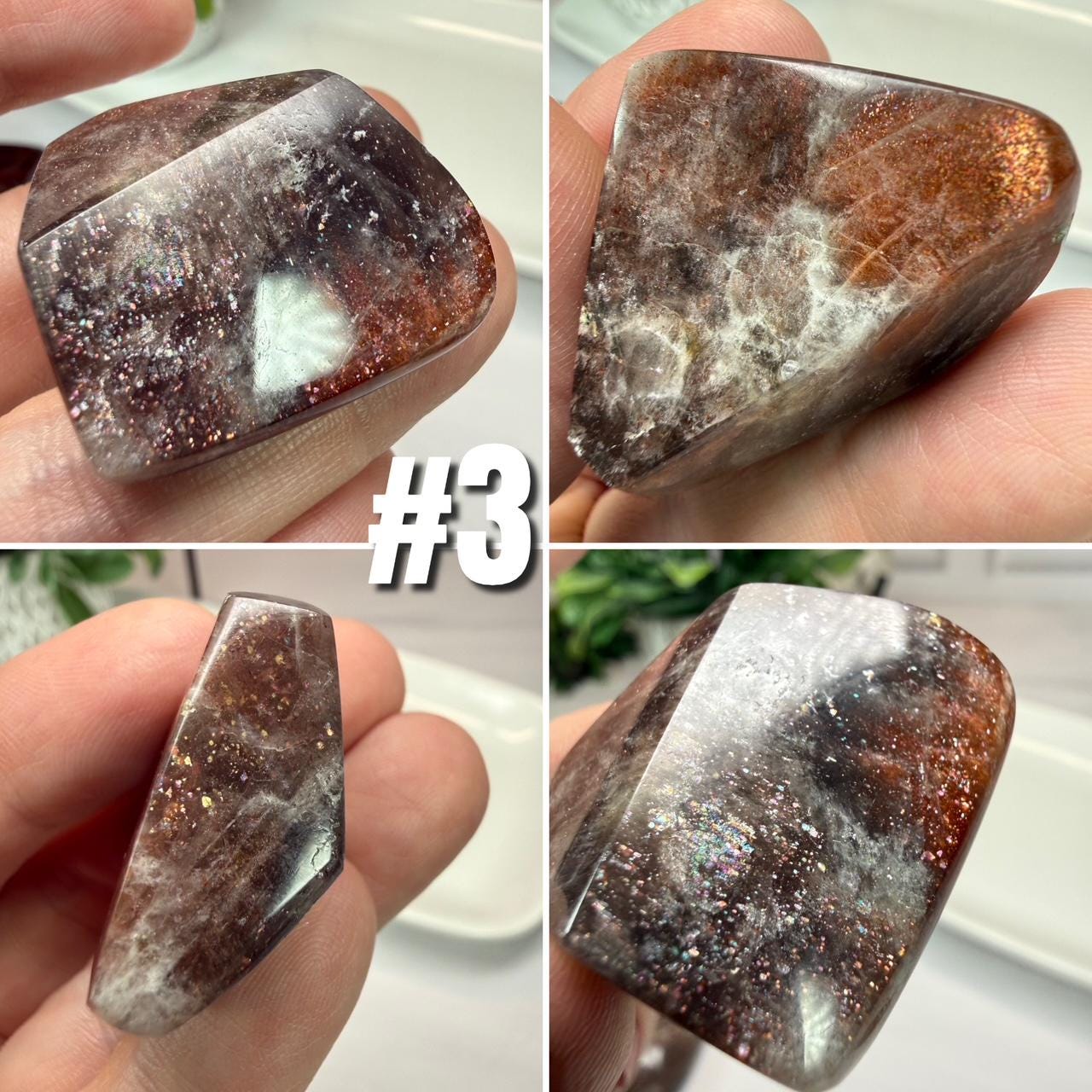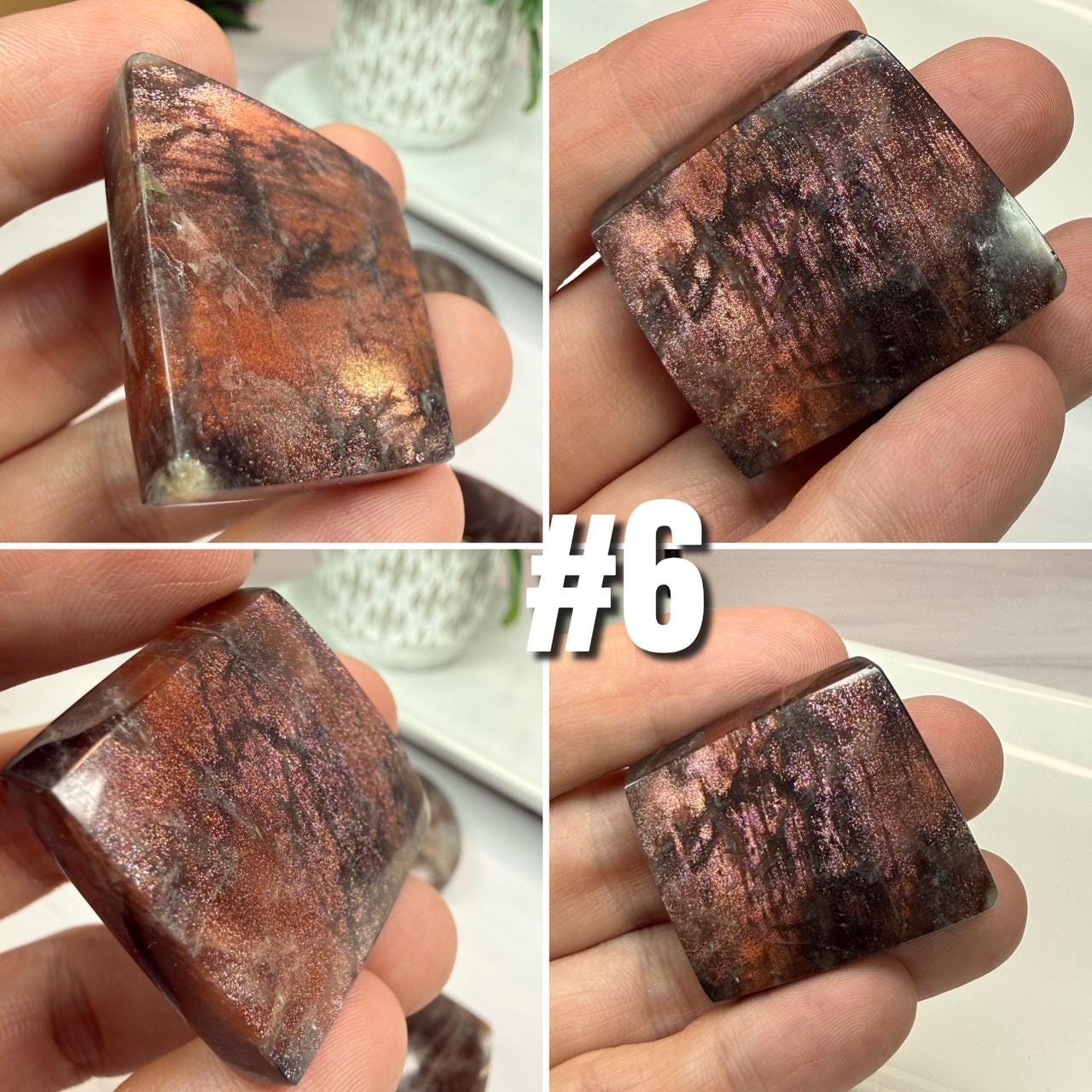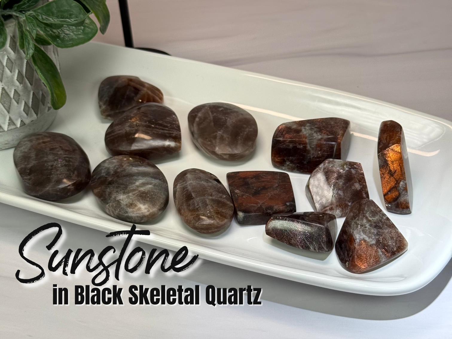 ð€Sunstone in Black Skeletal Quartz Freeform or Palm Stone, Sunstone and Skeletal Quartz
