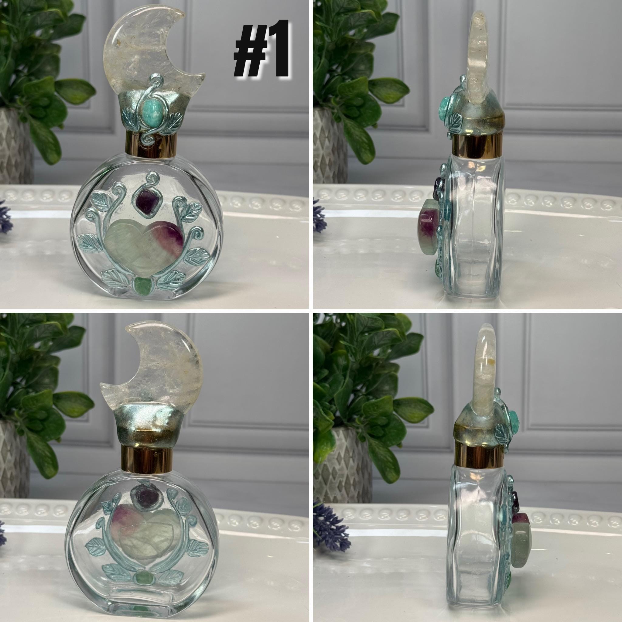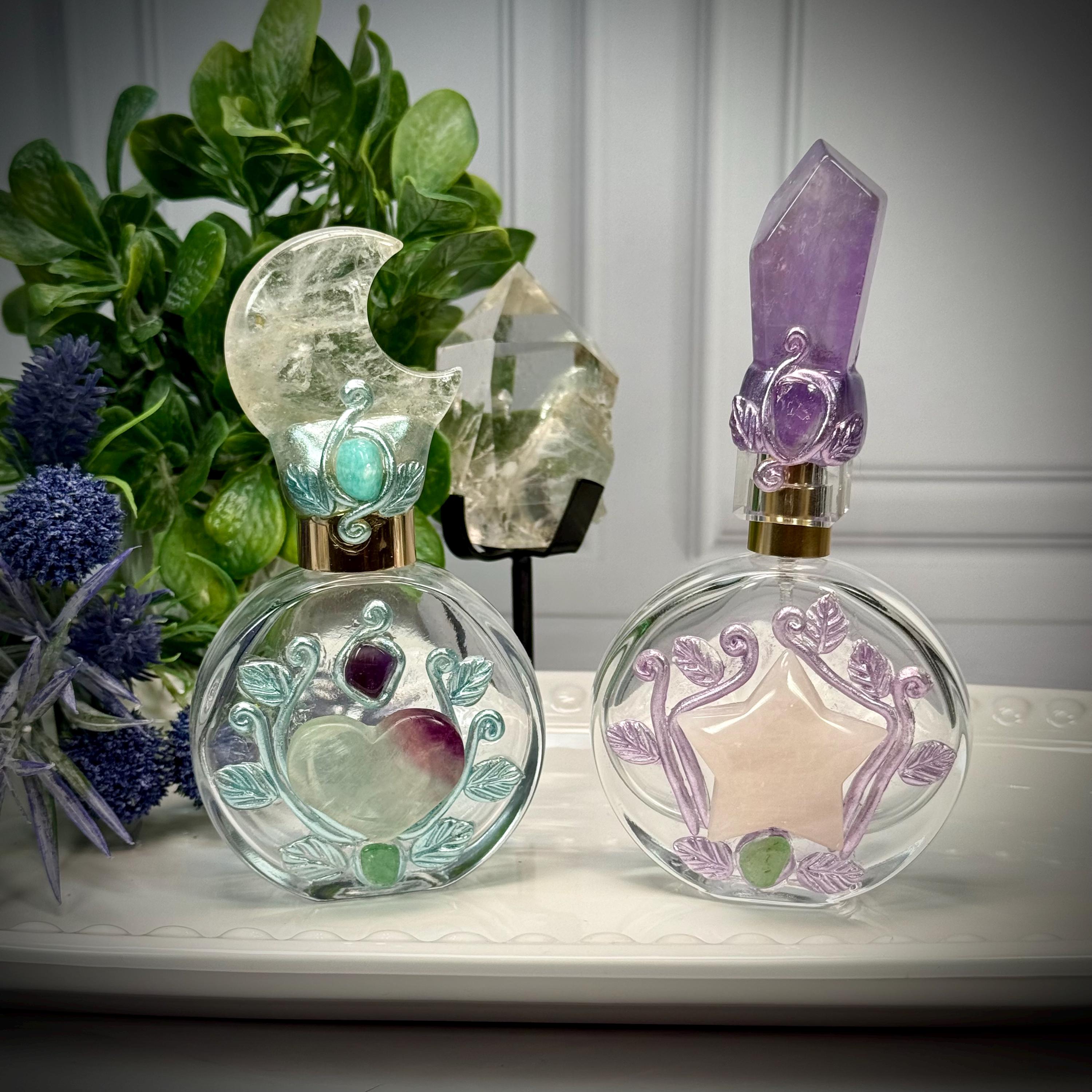 ✨Infused with enchantment and artisan charm, these handcrafted glass bottles are a spellbinding addition to any sacred space or vanity. Each bottle is adorned with intricate gemstone accents and sculpted botanical motifs - one crowned with a crescent moon, the other with a faceted amethyst stopper. Designed to hold your favorite oils, elixirs, or intentions, they evoke the magic of celestial dreams. Whether used in ritual or simply admired for their beauty, these vessels invite wonder, creativity, and a touch of fantasy into your everyday.
